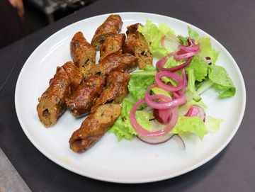 Minced lamb prepared with fresh herbs, skewered & fire-grilled in tandoor oven. Served with salad and mint sauce.