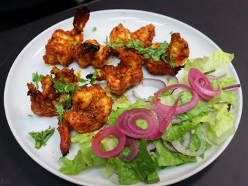 The Spice Room special - jumbo prawns marinated with fine spices, charbroiled and served sizzling. Served with salad and mint sauce.